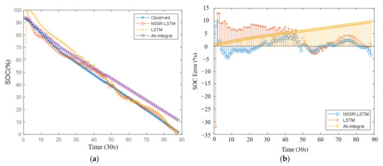 Figure 11) yields an SOC RMSE of 2.41% for the 700th cycle. In comparison, the Ah-integral method yields an SOC RMSE of 4.57%, and the LSTM only (in