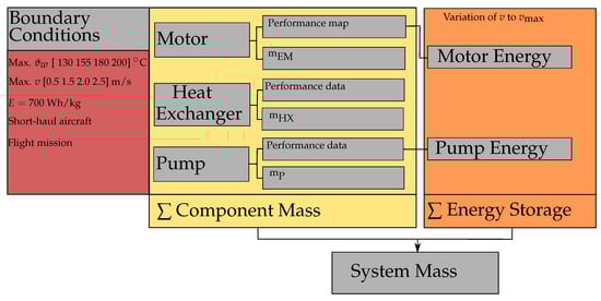 In this publication, a direct-conductor-cooled electric motor and its thermal system are investigated, with the basis of the investigation being a flight mission, and thus energy with an energy-storage density and component mass can be converted into a total mass. The total mass of the system is the overall objective, as shown in Figure 1. Therefore, the main objective for this publication is to find the design with the lowest mass by changing the requirements for the cooling system, which include the maximum winding temperature and the coolant velocity inside the cooling channels at take-off, and also the control of the cooling system during the flight, which includes the coolant velocity inside the cooling channels and the influence of this on the winding temperature.