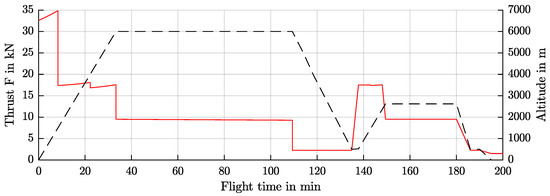 A regional short-haul aircraft was selected to provide the boundary conditions for the investigation. The flight mission is shown in Figure 4. This flight mission is used for the investigation of the ideal operating strategy for the cooling system and the evaluation of the overall mass. The aircraft is comparable to the ATR-72 with 78 seats, a flight distance of 1000 km and a maximum take-off weight of about 23,000 kg. The maximum payload is designed to be 7400 kg.