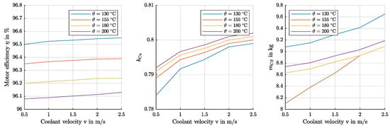 The impact of varying the maximum winding temperature and maximum coolant velocity on motor efficiency, the copper filling factor and the cooling system mass (pump and heat exchanger) is shown in Figure 7. It can be seen that the motor with the lowest winding temperature has the highest efficiency. Compared to the other models, the difference is rather small due to the higher possible copper filling factors at higher permissible winding temperatures. For the cooling system mass, the motor with a maximum winding temperature of C shows the lowest values due to a good trade-off between the pressure loss of the components and overall losses to be dissipated to the environment.