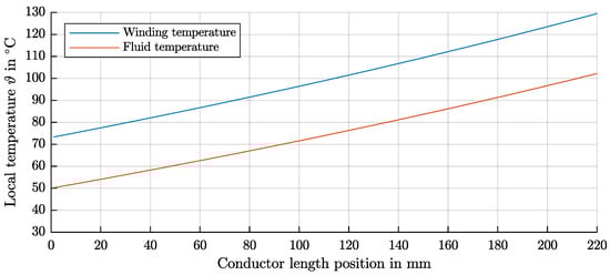 Figure 8 shows the temperature calculated with the proposed method in Section 3. The Figure shows that a large temperature gradient appears, since the fluid temperature rise is large due to a restricted pressure drop across the cooling channels of the electric motor. There is a presumption that mechanical stresses occur in the conductor with too large temperature gradients. One solution could be to induce two-phase operation through flow boiling (liquid and gaseous phase of the fluid). Flow boiling takes place at constant fluid temperature and gradients in the winding temperature can only occur due to varying heat-transfer coefficients with vapor quality. The potential of two-phase cooling with respect to lower thermal gradients in electrical components has been demonstrated in [30]. With the aspect ratio of the cooling channel, the temperature rise of the fluid can be adjusted to a certain extent. A cooling channel with a high width and low height favors a two-phase flow of the fluid due to a high cross-section that transfers the heat to the fluid. The overall fluid mass inside the conductor is reduced too, which is also advantageous for the two-phase flow.