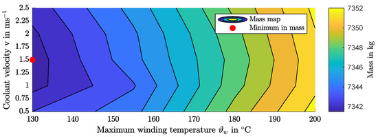 Figure 9 shows a map of the total powertrain mass for maximum winding temperature and the maximum coolant velocity. It can be seen that the temperature influences the overall mass more than the coolant velocity. It can also be seen that low coolant velocities are disadvantageous since the heat transfer is lower and therefore the copper cross-section is smaller, which leads to higher losses and therefore to increased mass of the energy storage. A high coolant velocity leads to higher pump energy consumption, but since the pump power is rather low, the impact is small. For the specified system, the optimum is located at C and . Table 4 shows the details of this design point.