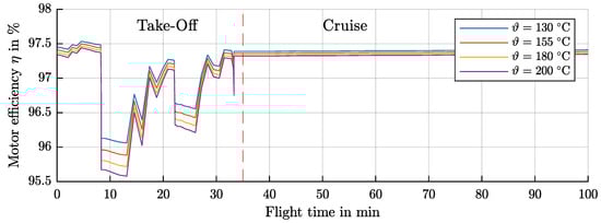Comparison of the efficiencies at different maximum winding temperatures during the flight mission.