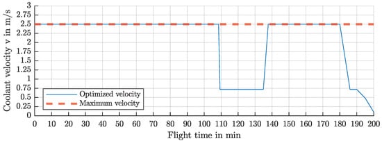 The optimization of the cooling system operation includes variation in the coolant flow velocity from 0.1 m/s up to the maximum flow velocity for which the cooling channel is sized. This must be done for each operating point of the flight mission and for every maximum winding temperature. Finally, it can be determined which flow rate the pump must provide to allow minimum energy consumption in the overall drive system.