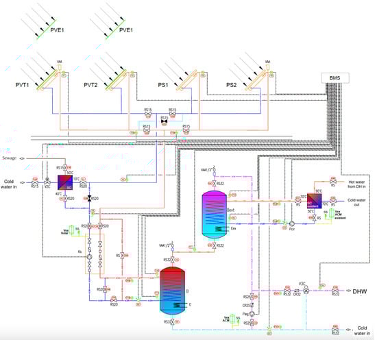 The entire system was designed for the dual purposes of preparing DHW and electricity and producing data on the external parameters, water demand, and the operational scenario of the system for subsequent analysis. The data obtained by monitoring the thermal and electrical parameters and the production and usage of hot water and electricity were displayed in a dispatcher as well as on a live monitor located inside the building.
