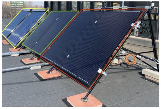Photograph of the panels installed on the roof, showing ST panels in yellow, PVT panels in green, and PV panels in red [20].