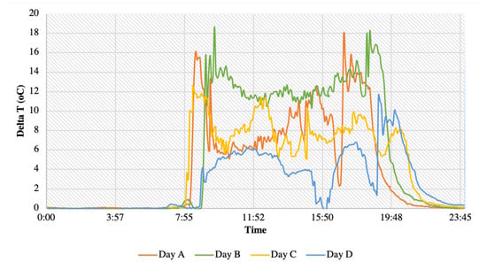 Figure 5 shows the temperature difference between the inlet and outlet for four representative days. It can be observed that the highest temperature increase occurs during day B, which is defined by high solar radiation, average ambient temperatures, and low water draw. On the other hand, the lowest increase occurs during day D, which is defined by high temperatures, high solar intensity, and high water draw. This is due to the fact that during this day the thermal energy accumulates in the tank, the temperature increases significantly, and the water draw is insufficient to cool it. During the course of this day, the delta T falls to 0 at around 15.50 PM, which was found to be simultaneous with the high water draw. This is due to the fact that there is a sudden large water draw and the tank is refilled with cold water from the main, causing it to lose its thermal stratification. During day A and day C, the temperature increase is variable in keeping with the high variation in the meteorological conditions. The period of heat accumulation starts around 8–8.30 a.m. depending on the particular day, and continues until late in the day at around 9.30–10 p.m.