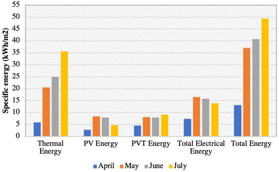 Data were collected over four months, from 1 April to 30 July. The instantaneous power during this period was measured at each time step, then the monthly specific energy output was calculated; the results are shown in Figure 6.