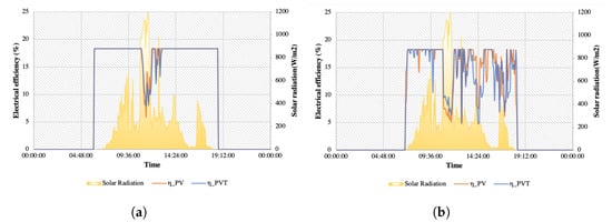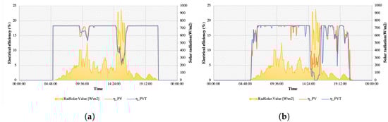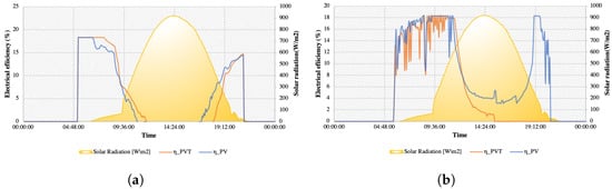 Figure 7 shows the electrical performance during day A. It can be observed that the efficiency calculated based on the temperature sensors (Figure 7a) shows higher values than the efficiency in Figure 7b calculated by the measured power. The measured power efficiency shows more dips during the day compared to the temperature efficiency. This example is a cloudy spring day with low ambient temperatures and variable solar radiation. Power production peaks before the peak of solar radiation due to the low operating temperature. Although power production increases when the solar radiation peaks, it does not reach the previous peak. Comparing PV and PVT, it can be observed that PVT performs slightly better in terms of both power production and efficiency.