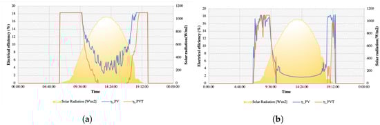 As a result of the comparison in Section 3, a few interesting facts can be observed. First, the electrical efficiency calculated as a function of the temperature recorded at the back of the panel is not entirely accurate. Furthermore, the electrical efficiency shows dips when the solar radiation peaks in intensity. When comparing the two type of collectors, PVT collectors have better performance on days when there is no excess heat accumulated in the tank (either because the heat is dissipated appropriately to the consumer or because the meteorological conditions do not lead to overheating). On the other hand, PV collectors have slightly better performance on days when the thermal energy accumulated in the tank is not dissipated, when instead of cooling the cells of the PVT the thermal agent contributes to heating the cells. This accentuates the importance of finding a suitable consumer for the system. Another solution would be to eliminate the provision of extra heat to a cold source; however, this would mean the loss of energy and a decrease in the overall efficiency of the system.
