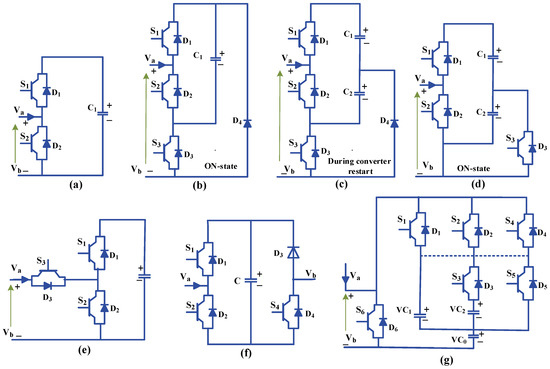 - Stacked switched capacitor (SSCSM): This is illustrated in Figure 3g. This topology is an enhanced unipolar SSCSM comprising six power switches and three capacitors (C1, C2, and C3). The physical volume of all capacitors in the SSCSM can be up to 60%. The performance of the SSCSM-based MMC model was found to be similar to that of the HB-based system. However, one of the main drawbacks of the SSCSM structure is the increased number of power devices, which leads to an increase in the power losses of between 7% and 15% during rated power operation [63].
