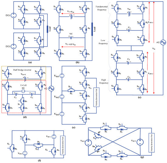 - Series-connected switched-source multilevel inverter (SCSS-MLI): The SCSS-MLI topology involves connecting voltage sources in series using power switches. A diagram of this configuration is shown in Figure 5e. The semiconductor power switches are connected to the poles of the voltage sources with lower magnitudes, and they are also connected to the poles of the voltage sources with higher magnitudes from an upstream source. This link is capable of synthesising a DC voltage with multiple levels, considering both polarities using the H-bridge. This structure reduces the number of switches required for the symmetrical inverter structure. However, this topology has several drawbacks, such as requiring power semiconductors with the same rating, making load sharing impossible due to various input stage configurations, and high-rated switches that need to be switched at the minimum possible frequency [73].