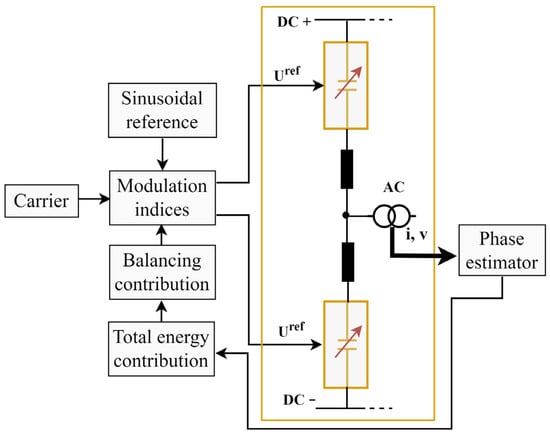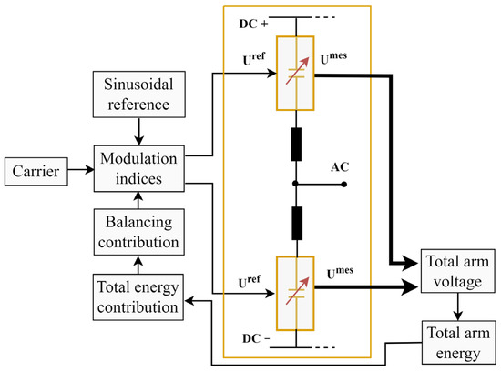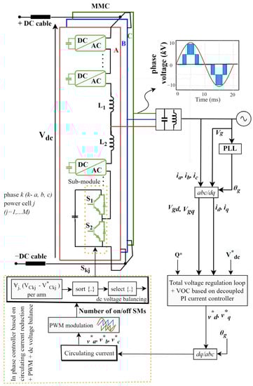 - Phase-shifted pulse width modulation (PS PWM): The configuration of the MMC topology is based on connecting a number of SMs, which are used in each phase leg to control the flow of the current and voltage to the load through an integrated system [92]. In this modulation technique, each SM in the MMC topology is controlled separately, and the balancing voltage function for each cell is divided into an averaging control and a balancing control, where (N + 1) levels require several triangular carrier waveforms, and all carriers must have the same frequency and peak of the amplitude as there is a phase shift between the adjacent carriers, this shift being given by φc = 360°/N. Therefore, the waveforms of triangular carriers for each phase are implemented according to the subharmonic techniques [93]. The average voltage at each individual SM capacitor is controlled by the averaging and balancing technique, respectively. The main drawback of the PS PWM technique is that the implementation voltage rises significantly when the number of SMs in each arm phase is increased, which leads to instability under certain operating conditions [94].