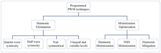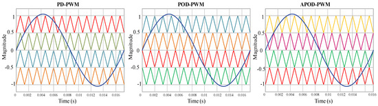 - Level-shifted pulse width modulation (LS-PWM): The gate signals of power devices in each cell are immediately specified by comparing the reference voltage signal with the carrier’s signals. N is the number of carrier waveforms required in the control system, where these carriers are placed vertically, and their bands are arranged based on the LS techniques. The total switching of all the SMs in the upper and lower arms of the MMC topology will be equal to the carrier frequency, meaning that the number of SMs can be assumed to be four cells in both arms, in which case four N carriers will be used and vertically distributed from −Vdc/2 to Vdc/2 volts, and their magnitude is 0.25 to modify the waveform where the modulating waveform is shifted by fully turning on some of SMs and other SMs being turned off (bypassed) to generate an N − 1 voltage level at output side [89,90]. As shown in Figure 6, the most-common multiple carrier level-shifted techniques used for MMC control systems are classified into the: in-phase disposition (PD PWM), opposition disposition (OD PWM), and alternative opposition disposition (AOD PWM) techniques [91]. Figure 8 shows five level output waveforms of the aforementioned techniques, where in the PD PWM technique, the carrier signals are level-shifted, but all are in same phase. In the POD PWM technique, the positive carrier signals will have a 180° phase shift with the negative carrier signals, and in APOD PWM, the alternate carrier signals will have a 180° phase shift. The PD PWM control strategy has gained wide acceptance in the design of the MMC topology compared to other control technologies as this technique provides load voltage and current with lower losses and less total harmonic distortion (THD) [70].