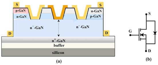 - Liu, C.; Khadar, R.A.; Matioli, E. GaN-on-Si Quasi-Vertical Power MOSFETs. IEEE Electron Device Lett. 2018, 39, 71–74. [Google Scholar] [CrossRef]