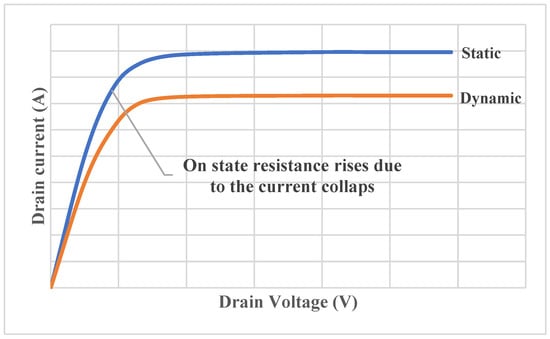 - Suppressing the collapse current effect: The effect of the current collapse of the AlGaN/GaN HEMT power devices is one of the major challenges that must be solved to achieve the success of GaN devices in high-power converters. The current collapse effect occurs when a great bias is applied to the drain terminal, where the leakage of the current decays, as shown in Figure 19. The phenomenon of the current collapse effect of GaN devices mainly includes the following [157,158]: