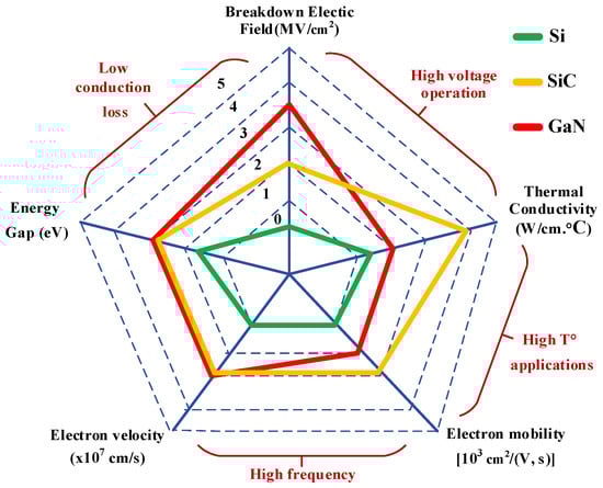 - Kumar, A.; Moradpour, M.; Losito, M.; Franke, W.-T.; Ramasamy, S.; Baccoli, R.; Gatto, G. Wide Band Gap Devices and Their Application in Power Electronics. Energies 2022, 15, 9172. [Google Scholar] [CrossRef]