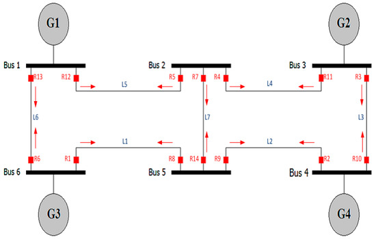 Figure 5 presents the single-line diagram of the IEEE 6-bus network, which consists of seven branches, four power generators, and 14 relays. The objective is to optimize the settings of the 14 relays, with the main goal of determining the optimal TMS and PS. At the closed end of each relay, three-phase short circuits are connected. Table 8 provides information on the primary/backup relay pairs and the close-in short-circuit currents, while Table 9 presents the CTRs of the relays. The CTI value is selected as 0.2 s. The values of the continuous TMS in the linear programming formulation lie in the range [0.1, 1.1]. The PS values are fixed constants given in Table 10. In the nonlinear programming formulation, the continuous variables PS and TMS both have ranges between [1.5, 5.0] and [0.1, 1.1], respectively. This test system has 76 constraints in total, including 14 inequality constraints for the minimum operating times, 14 inequality constraints for the maximum operating times, 20 inequality constraints for selectivity criteria, 14 side constraints for the TMS, and 14 side constraints for the PS.