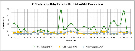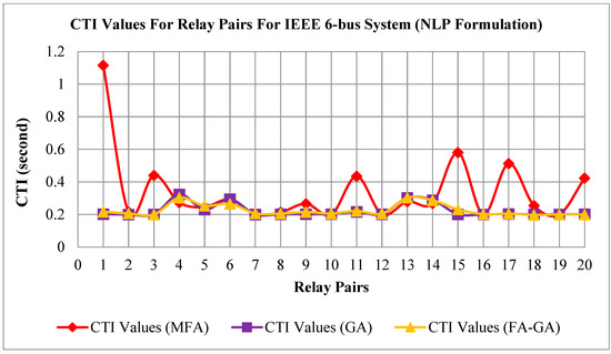 CTI between relay pairs for the IEEE 3-bus system (NLP formulation).