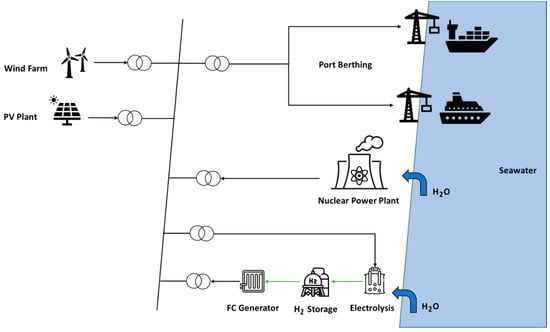 Furthermore, the concept of Nuclear-Renewable Hybrid Energy Systems (N-R HES) has emerged as a promising approach to tackle the challenges associated with vessel emissions. These systems combine nuclear energy’s reliable and continuous power generation with the flexibility and renewable attributes of sources such as wind and solar. Integrating various energy sources in a Nuclear-Renewable Hybrid Energy System can deliver a reliable and environmentally friendly electricity supply for cold-ironing operations. This integration helps reduce energy expenses and environmental harm. Implementing such systems can significantly improve the maritime industry’s sustainability and support global climate change efforts [].