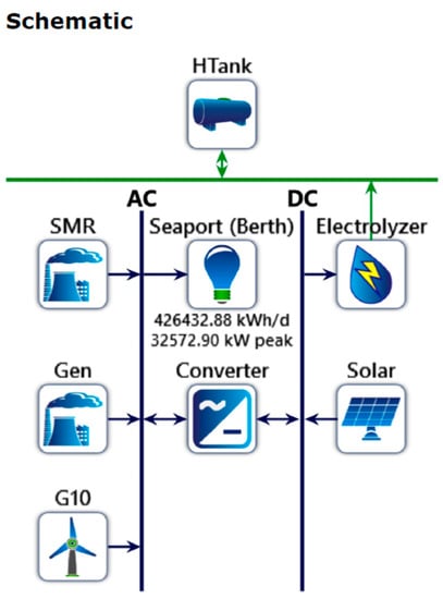 This case study aims to examine the feasibility and potential advantages of combining nuclear power with renewable energy sources to establish a Hybrid Energy System for Tanjung Priok Port. This integrated system aims to offer a reliable, clean, and cost-effective energy supply for the port’s operations while minimizing its environmental impact. Figure 4 depicts the schematic of the system, comprising a Small Modular Reactor as the primary baseload energy source. Additionally, auxiliary renewable sources such as wind and solar systems and a hydrogen production system through electrolysis are incorporated. This hydrogen production system stores excess energy and provides power when needed.