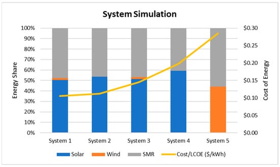 Based on the economic and technical input presented previously in Table 3, Table 4 and Table 5, the software presented several possible scenarios that vary each energy source’s capacity power, affecting the economic analysis. Figure 6 presents a graph that displays five scenarios, with the best scenario on the left and progressing toward the right. It represents different combinations of Solar, Wind, and Nuclear energy sources. The best scenario, located on the left side of the graph, is determined based on its energy cost, which is $0.105 per kilowatt-hour (kWh). It is the most cost-effective option among the five scenarios.