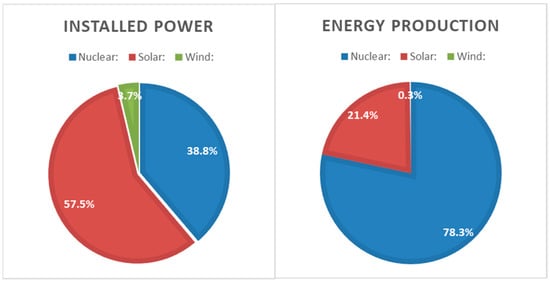 In terms of installed power distribution, the best scenario consists of 38.8% nuclear, 57.5% solar, and 3.7% wind energy. This configuration reflects the optimal mix of energy sources for power generation. Considering the production capacity share, the best scenario shows that 78.3% of the total energy production capacity comes from nuclear energy, followed by 21.4% from solar energy, and 0.3% from wind energy, as shown in Figure 7.