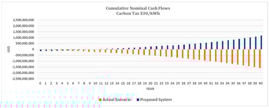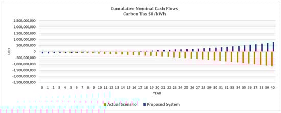 This work considered three different analyses over 40 years. The first analysis, as depicted in Figure 8, disregards carbon taxation. In this scenario, the system yielded a return on investment of 14 years. From the investor’s perspective, maintaining the conventional system would result in an expenditure of over 1.32 billion USD by the end of the analyzed period. Conversely, if the proposed system is implemented, the investment would have returned after 14 years, resulting in a positive cash flow of 925 million USD at the end of the period.