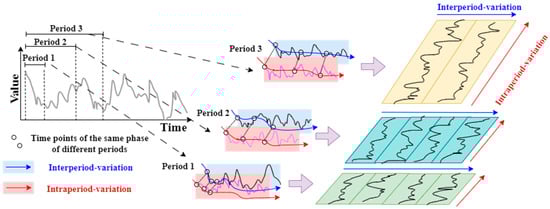 In the real world, time series often exhibit multiple periodicities and are influenced by the mutual interactions among these periods, resulting in highly complex variations. This complexity poses challenges for modeling time series data in short-term load forecasting. Conventional approaches in time series analysis primarily focus on the continuity and recursion of time series while overlooking the underlying multi-periodicity. In contrast, TimesNet treats individual time points in a time series as relatively independent. On one hand, it considers overlapping time segments, capturing the interplay between different segments and emphasizing the inter-period variation. On the other hand, it examines the relationships between individual time points within each segment, focusing on the variations between adjacent moments within the same period, which are referred to as intra-period variations [29]. However, traditional methods for modeling time series in 1D space fail to aggregate time points of different periods into the same phase, instead, they are scattered throughout the entire time series, making it challenging to achieve mutual attention. Additionally, these methods are unable to identify the impact relationships between different time segments, making it difficult to capture both types of changes simultaneously in 1D space modeling. To address this issue, TimesNet extends the analysis of temporal variations into a 2D space, as shown in Figure 1. The 1D time series is reshaped into a 2D tensor, where each column contains time points within a period, and each row contains time points corresponding to the same phase across different periods.