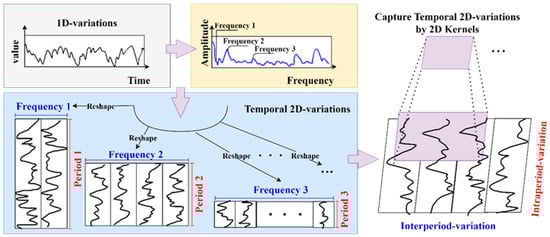 First, the 1D temporal features of the input are extracted for periods and transformed into a 2D tensor to represent the 2D temporal changes. Following the process described in the previous discuss, the formulas can be rewritten as: