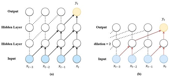Although the stacking of causal convolutional layers can increase the receptive field of the network, the number layers of causal convolution will be increased for a long sequence and then lead to the gradient vanishing and exploding. The TCN introduces dilated convolutions to exponentially increase the receptive field of the network. Dilated convolution involves sampling the input of the upper layer with a certain interval, and the dilation rate grows exponentially with a base of 2 [34]. In this way, it can achieve a large receptive field with fewer layers of the network. The computation formula for dilated convolution is as follows: