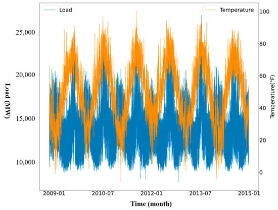 Due to various external factors, power load data often exhibit fluctuations and randomness, making accurate load prediction challenging. Therefore, selecting appropriate features is crucial to improve the prediction accuracy of the model. To select suitable features as inputs for the model, an analysis of the original dataset is required. Figure 7 shows the change of load demand for 30 days in the New England region of the United States. It is evident that the changing trend of power load data exhibits a weekly pattern, with smaller fluctuations during weekdays and significantly higher load during weekends. This observation suggests that the reduced overall electricity load on weekends may be due to the shutdown of institutions such as companies and factories with high electricity consumption. Similarly, some national holidays are also likely to have a significant impact on the power load. Figure 8 depicts the profiles of power load and temperature over 6 years based on the ISO-NE dataset. It can be observed that the power load has 12 peaks and valleys, because the power demand usually reaches peaks when the temperature is very high or low. Therefore, temperature and day types have a significant impact on STLF. Considering the periodicity, randomness, trend, and external factors affecting electricity load, the experiments select five features, i.e., power load, temperature, holidays, seasons, and weekends, for load forecasting.