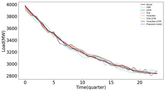 In order to visually demonstrate the superiority of the proposed model, Figure 9 presents the load prediction curves of all the models and the actual load data for 24 h. One can find that the predicted load values of all the models can roughly fit the changing trend of the actual load data. However, the proposed model shows a stronger fitting capability to the actual load data compared to other comparative models, especially during the peak or valley region.
