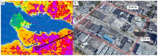 Urban neighborhoods are generally characterized with dense buildings and low vegetation cover. Accordingly, an urban area with these features and high urban surface temperature readings was chosen for this work. Figure 1a shows the urban heat islands in a section of Vancouver; the purple and red areas have higher temperatures compared to their surroundings. Based on the temperature distribution and taking the surrounding landscape into consideration, a study area in the Mount Pleasant neighborhood, shown in Figure 1b, was selected for the study. The study area is 172 m × 214 m and bounded by Manitoba Street and Columbia Street in the east and west and by West 5th Avenue and West 7th Avenue in the north and south, respectively.