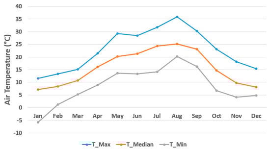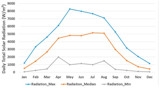 As mentioned earlier, part of the datasets required for training and testing the ANN models was generated from the microclimate model simulation results and given that an hourly simulation of a full year is not practical due to extensive simulation time and calculation costs, some days in each month were selected to be representative of that month. This selection was based on different weather parameters, including air temperature, solar radiation, and wind speed. Since the effect of cloud cover is already considered in solar radiation, this parameter is not included. As a result, the selected days represented the hottest and the coldest days, the days with the highest and the lowest solar radiation, and the days with median daily average temperature and daily total solar radiation for each month. These days were selected by ordering the days by daily average temperature and daily total solar radiation and identifying the days with the extreme and average temperatures and solar radiation. Inclusion of extreme values is essential in the training and application of the ANN models in the wide range. The same selection procedure was implemented for each month, and a weather dataset with a total of 72 days was established for the study. Figure 2 and Figure 3 illustrate the maximum, median, and minimum of daily air temperature and daily total global solar radiation, respectively, for the study area in the year 2020.