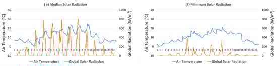 Figure 4 illustrates the hourly air temperature and global radiation of the monthly representative days assembled for the whole year. Figure 4a–c shows the hourly air temperature and solar radiation of the days selected from each month based on maximum, median, and minimum daily average air temperature, whereas the data shown in Figure 4d–f are for days with the highest, median, and lowest daily total solar radiation. The lowest and highest hourly temperatures in the assembled dataset are −8.05 °C in January and 35.55 °C in August. The highest solar radiation is 938 W/m2 in June and the winter months in general have lower solar radiation. Having a dataset with a mix of extreme and average weather conditions is essential to develop a robust ANN model.