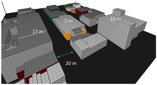 To create the computation domain, an aerial image of the study area (214 m by 172 m) was exported from Google maps, and then imported into ENVI-met’s Space Module. Based on the imported image of the area and the position and dimension of the buildings, the urban geometry and the computational domain were created (see Figure 5). To reduce computational time and resources, some simplifications were made to building geometries, such as omitting windows, balconies, and architectural details, which are considered to have a small effect in the relatively large-scale urban climate modeling. The physical properties of each building and surface were defined by thermal conductivity and heat capacity, as well as the surface radiation properties, emissivity, and absorptivity. All the buildings in the area are concrete buildings with assumed construction layers of 1 cm plaster on the exterior, followed by 12 cm insulation, and 18 cm concrete wall in the interior to satisfy the minimum R value of the building code, and the pavement between the buildings is asphalt. Using an albedo meter, the solar absorptivity of the buildings’ surfaces and the pavements was determined and assigned to each surface in the ENVI-met model. The indoor temperature of the buildings was assumed to be 23 °C (average of the National Energy Code of Canada heating and cooling setpoints, 22 °C and 24 °C, respectively). The temperature, humidity, and wind speed at each grid cell were computed from the conservation of mass, momentum, and energy equations, considering the grid cells’ thermal properties and exposure to convective, short-, and longwave radiation fluxes, as well as latent heat fluxes. Detailed discussion on the governing equations implemented in the model can be found in the ENVI-met user manual [39,40]. While the inlet boundary conditions are defined by the hourly varying air temperature, relative humidity, and wind speed, an outflow and zero pressure were specified at the outlet boundaries. Short- and longwave radiation were directly applied on the cells’ surfaces based on their sky view factor.