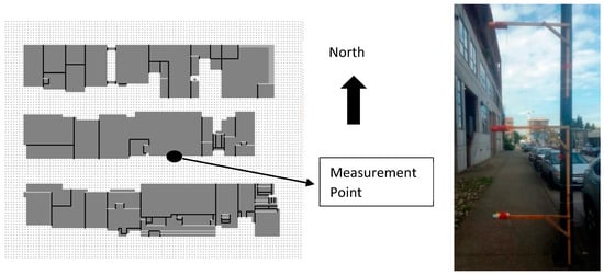 Prior to using the ENVI-met model, its accuracy was assessed by comparing the simulation results with onsite measured data. In the field, the temperature and relative humidity measurements were collected at 0.6 m, 1.8 m, and 3 m high from the ground (see Figure 6) using HOBO U10-003 data loggers. The data loggers have ±0.5 °C and ±3.5% accuracy of temperature and relative humidity, respectively. They were positioned in opaque cylindrical tubes that were wrapped with reflective tape for radiation shielding, open on both sides for ventilation, and attached at the end of square wooden sticks. A point close to building façade with an electric post was selected to attach these HOBOs.