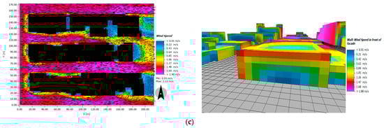 Site measurements were taken on 9 September 2021, starting from 7 a.m. to 5 p.m. After 5 p.m., the setup was removed and the measured data from the HOBOs were extracted. For the ENVI-met simulation, the hourly weather data for the same day measured at the nearby weather station were used to establish the boundary conditions. Figure 7 shows the air temperature and airflow patterns obtained from the ENVI-met simulation at the time the field measurement was conducted. The asterisk (*) marks the temperature probe point, and the building blocks are denoted as 1, 2, and 3. In general, as the air flows from left to right, its temperature increases, as shown in the air temperature contour plots at 10 a.m. and 4 p.m. in Figure 7a. The air heating effect can be attributed to the heat transfer from the building façades and the ground, which are being heated by the solar radiation. The temperature contour plots also show relatively higher air temperatures at the section of the block where the buildings are in close proximity, 1 and 3 in contrast to 1 and 2. Moreover, the air temperature close to the south-facing façade is relatively warmer than the air temperature at the middle of the street and the air temperature close to the north-facing façade. Figure 7b shows the air temperature distribution across the street (horizontally) at 1.8 m high from the ground, and vertically 1 m away from the south-facing façade of Building 1. As can be shown in the figure on the left, the air temperature near the south-facing façade of Building 1 is consistently higher from 8 a.m. to 5 p.m. when compared to that of the north-facing façade of Building 2. The temperature difference is associated with differences in the solar heating effect of the façades due to each façade’s solar orientation and shading effects. The figure on the right presents the hourly air temperature at different heights in front of the south-facing façade of Building 1. The results show vertical temperature variations along the height during the daytime. Due to the ground heating effect, the air temperature close to the ground is higher and decreases as the distance from the ground increases. At noon time, for example, the air temperature near the ground level (0.6 m) is 1.7 °C higher than the air temperature at 12 m from the ground. Figure 7c shows the airflow patterns around the buildings and the air velocity over the buildings’ façades. As can be seen in the left figure, the building blocks created a Venturi effect at the beginning of the canopy and resulted in an increase in the air velocity by 40% from 1.4 m/s to 1.9 m/s. The influence of wind on the urban canopy temperature depends on the magnitude and direction of the wind. The influence of wind flowing perpendicular to the building blocks is marginal, as the air velocity within the canopy remains nearly zero. The figure on the right shows the velocity contour plots on the buildings’ façades. The air velocities vary from 0 m/s (stagnation region) to 1.9 m/s around the edges of the windward surface. Establishing wind velocity distribution on building surfaces allows for proper accounting of the heat exchanges between the surrounding air and the building surfaces [41,42].