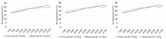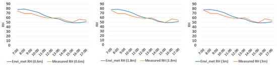 As presented in Table 3, the highest RMSE and MAE values were calculated at near ground level (0.6 m from the ground), while the lowest errors were calculated at the upper position (3 m from the ground). The overall RMSE and MAE values of the simulation were 1.35 °C and 1.1 °C for temperature, respectively, and 5.12% and 4.17% for relative humidity, respectively.