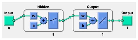In order to determine the number of neurons in the hidden layer, six ANNs with 1, 8, 15, 17, 20, and 100 hidden neurons were evaluated. The neural network training process is inherently randomized. This means that even when they are provided with exactly the same training data, the resulting neural network model will not be identical. Accordingly, in this study, the neural networks were trained five times with the same training data and their accuracy was assessed based on their RMSE values. Table 5 provides the RMSE values of the six ANNs for the five runs. As can be seen in the table, the ANNs with hidden neuron numbers from 8 to 17 had a very similar performance and by increasing the number of hidden layers the performance of the ANN will be reduced. This is in accordance with the findings of Dong et al. (2018) [45], who proposed that the maximum number of hidden-layer neurons is to be specified as 2 × N o .   i n p u t s + 1 . Given that the ANN with eight hidden layers yielded the lowest overall RMSE and the lowest average RMSE of all the considered ANNs, it was adapted in the ANN-AirTemperature model used in this study. The RMSE and MAE of the created ANN-AirTemperature were 1.217 °C and 1 °C, respectively. The schematic of the ANN model with eight inputs, one output and eight hidden neurons is illustrated in Figure 10. In this figure, the numbers under Input box and Output box show the number of inputs and outputs and the number under the Hidden box shows the number of neurons.