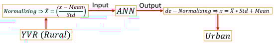 The hourly urban canopy temperature for a whole-year period can be generated from the YVR airport weather station data using the created ANN model. First, the YVR weather parameters are normalized using the mean and standard deviation values that were established for the input parameters in Section 4.1. The process of generating the canopy air temperature is summarized in Figure 11. The urban canopy wind speed can also be generated in a similar fashion. The normalized 8760 dataset is then introduced into the ANNs as input, and the corresponding urban air temperature and wind speed are obtained as an output of the ANN models. Finally, the ANN outputs are denormalized using the mean and Stds of the outputs of the training dataset.