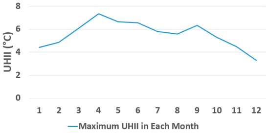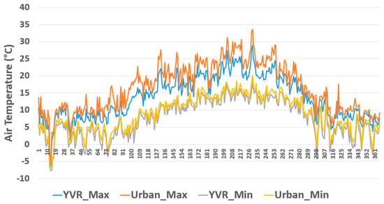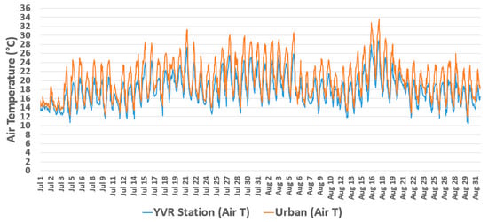 Figure 12 presents the hourly predicted urban canopy air temperature for the study’s urban area and the air temperature recorded at the YVR weather station for the month of July as an example. The urban canopy temperature in general is 3 °C to 5 °C higher than measurements at the YVR airport during daytime and 1 °C to 2 °C higher at nighttime. Figure 13 shows the daily maximum and minimum air temperatures in the study area and the YVR weather file for the full year. As can be seen in the figure, the daily maximum and minimum temperatures are consistently higher in the urban area, and the differences in comparison to that of the airport weather station are much higher in the period from April to September. The higher temperatures in the study area are associated with the urban heat island effect. For the location, the annual average urban heat island intensity (UHII), which is defined as the average of the urban and the metrological weather station air temperature differences, is 1.7 °C. Figure 14 illustrates the maximum UHII values for each month. The highest UHII value is 7.3 °C, which is during the month of April, and the lowest monthly maximum UHII is in December. The UHII values in the winter months can be attributed mainly to the anthropogenic effect associated with heat release from vehicles and buildings and the wind-blocking effect.