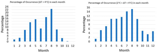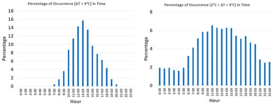 The monthly and hourly UHII distributions for the simulated year, categorized into two groups based on the hourly temperature differences, are presented in Figure 15 and Figure 16, respectively. The highest percentage of occurrences with a temperature difference greater than 4 °C happen in the month of August, 22.2%, followed by 16.8% in the month of July. The high percentage of modest temperature differences (2 °C and 4 °C) are similarly found in the warmer months; August, 15% and July, 14%. Figure 16 presents the temperature difference distribution with respect to the time of day. As can be seen from the distribution, the difference in the urban and the YVR temperatures peaks at 1 p.m. About 55% of the temperature differences above 4 °C are observed between 11 a.m. and 2 p.m., and temperature differences between 2 °C and 4 °C are observed uniformly between 8 a.m. and 8 p.m.