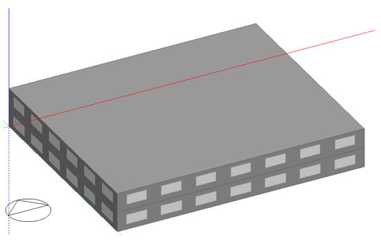 The building type considered for the study was a two-story concrete office building with a floor area of 1216 m2 (see Figure 17). As per the ASHRAE 90.1 requirements for non-residential mass buildings, the exterior walls, which are composed of 0.18 m concrete followed by 0.07 m EPS and 0.01 m plaster on the exterior, have an overall U value of 0.5 W/m2K. The metal deck roof has an overall U value of 0.18 W/m2K. The ground floor is composed of 0.15 m EPS at the bottom followed by 0.1 m concrete and 0.03 m ceramic tiles on the top, and has an overall U value of 0.25 W/m2K. The SHGC and U values of the windows are 0.38 and 1.76 W/m2K, respectively. The physical and thermal properties of the materials of different layers of the building envelope are summarized in Table 6. Following the Canadian National Building Energy Code (NECB), the building airtightness is set to 0.2 L/s/m2. The buildings’ internal loads including occupancy, lighting, equipment, and ventilation, and their respective operating schedules are adapted from the NECB. The cooling and heating set points are set at 24 °C and 22 °C, respectively, during the weekdays between 6 a.m. and 8 p.m. During all other times, the cooling system is off and a setback temperature of 18 °C is enforced during the heating season.