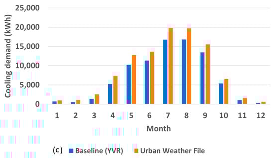 Figure 18 shows the monthly heating, cooling, and total energy consumption of the buildings in the study area (urban environment) and the YVR airport (rural environment). As the buildings are office buildings with significant internal gains, the cooling energy demand in the summer months is much higher than the heating energy demand in the heating season (roughly one-to-ten ratio), as illustrated in Figure 18a. During the colder months, the heating energy consumption of the building in the study area was consistently lower than that of the building at YVR (Figure 18b). The reduction in energy consumption during the months of December, January, and February was 26%, 20%, and 33%, respectively. The decrease in heating energy in the study area is associated with the higher canopy air temperature as the result of the urban heat island effect, as well as the reduction in air flow speed due to the wind-blockage effect of buildings. Due to the same effects, the buildings’ energy consumption in the warmer months was in inverse order (Figure 18c). The highest cooling demands were in July and August, and during these months the buildings in the urban environment had a cooling energy demand of 17% and 18% more, respectively, than that of the building at YVR airport. In Table 7, the annual heating, cooling, and total energy demands of the buildings are presented. As was expected, the urban heat island effect increased the total cooling energy demand by 23% and decreased the total heating energy consumption by 29%. Although the percentage change for heating is higher, the magnitude of the cooling energy difference is much higher. As such, the total energy demand of the building in the urban area is 18% higher, which points to the overall negative effect of the urban island effect in that significant increases in cooling counteract the benefit obtained in the reduction in heating in the winter season.