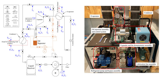 The M-RVE prototype was directly coupled to a dynamometer with a hysteresis brake to control and measure its speed and torque (Figure 1 (right)). Two 10 kW brazed plate heat exchangers were used as the evaporator and condenser. The heat was supplied to the evaporator using a 9-kW water heater, and a 10-kW chiller was used as the heat sink. A lubrication system was integrated to feed the expander at the inlet. The flow rate and pressure of the lubricant were controlled using a needle valve and a back pressure regulator, respectively. After lubricating the expander, the oil was separated from the refrigerant in a separator and travelled to the expander inlet using an oil pump. The lubrication line assembly is shown in Figure 1 (right). The refrigerant flow rate was measured using a Coriolis mass flow meter after the refrigerant pump, and the temperature and pressure were measured at the desired points using T-type thermocouples and pressure transducers. The accuracy and specification of the measurement devices are reported in Table 1.