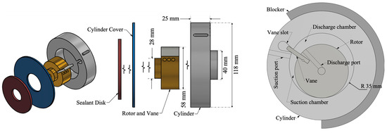 The M-RVE prototype consists of a rotor, a cylinder, a vane, and a stationary suction timing mechanism called a blocker. The revolving vane mechanism was initially introduced as a compressor in 2006 [23] and then studied as an expander replacing the expansion valve in refrigeration systems (the RV-I prototype) [24] and ORC applications (the M-RVE prototype) [25]. In this mechanism, the vane is attached to the rotor, and the rotor is positioned eccentrically to the cylinder, which creates the working chambers. When the suction port on the cylinder is uncovered by the stationary blocker, the suction process begins and continues until the suction port is covered by the blocker. Then, the working fluid undergoes the expansion process. At the end of one revolution, the expanded working fluid enters the discharge chamber and leaves the expander via the discharge ports on the rotor. Figure 2 illustrates the schematic of the M-RVE prototype. In the current study, a brand-new Teflon-made end-face sealant disk was used in the M-RVE prototype as signs of wear were observed on the disk when disassembled [15]. Moreover, the rotary seals were replaced.