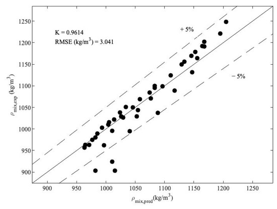Calculated and measured mixture density—Dashed lines are the ± 5% error margins (the experimental densities are adopted from [21]).