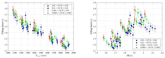 Figure 4 (right) demonstrates the changes in FF at different pressure ratios (PRs) for different ranges of OCRs. At a fixed OCR, the FF increases with an increase in PR. This is due to a higher PR across the leakage paths leading to higher leakages. Moreover, it is observed that higher PRs are achieved with higher OCRs. The FF ranged from 1.1 to 1.8 in this study, where the lowest FF corresponded to a PR of 1.7, expander suction temperature of 54 °C, and shaft speed of 1879 rpm.